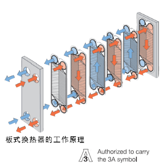 板式换热器由一组金属波纹板构成,其上带有开孔,开孔形成液体流动的通道,热量将在两种液体之间传递。该板片组装配在固定板与压紧板之间,并通过拧紧螺栓压紧。这些板片上都装有密封垫,密封垫对板间通道起密封作用并使液体流入相邻通道。板片数由物料的流量、物理特性、压降和温差确定。板片波纹引起液体紊流并支撑板片承受差压。